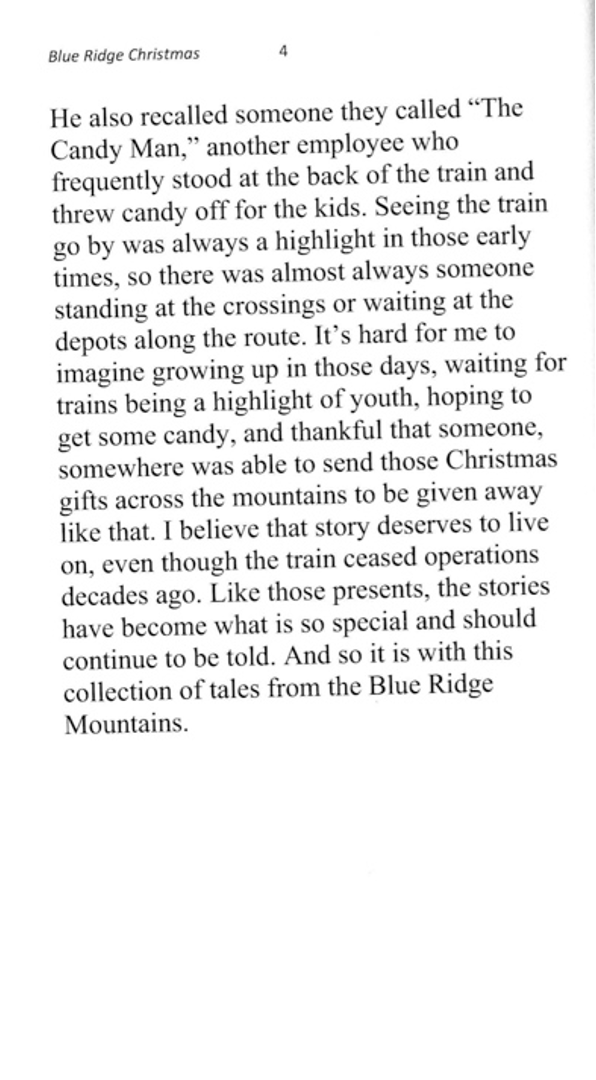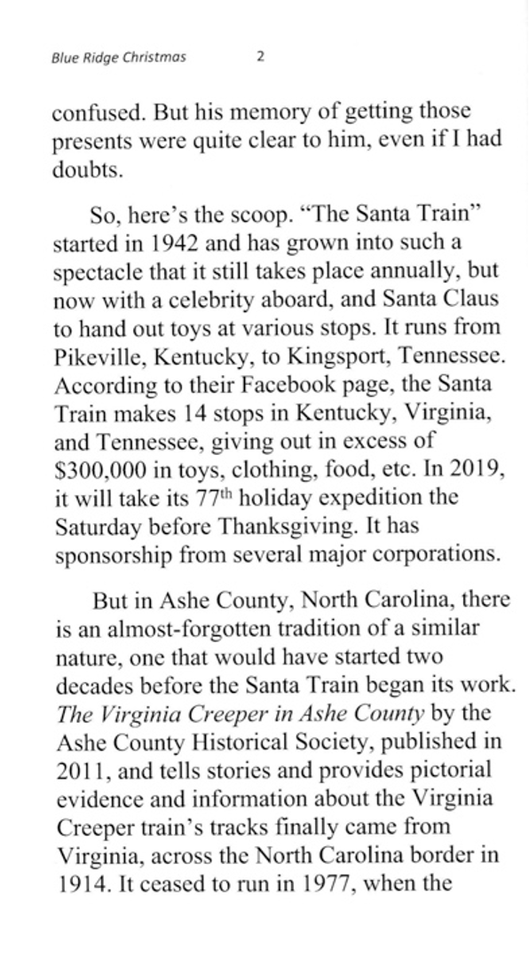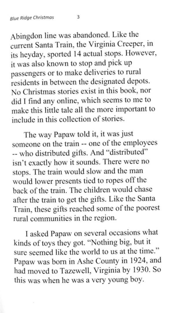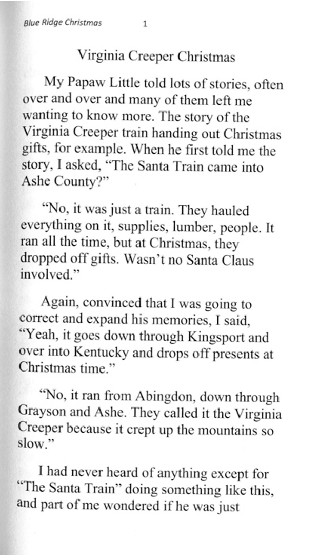 A collection of stories about Christmas in rural Virginia and Tennessee, starting with a tale from the Virginia Creeper Train line in Ashe County, NC, from the 1920’s, and ending with a woman’s Christmas story from the first round of check distributions from Dolly Parton’s My People Fund after the wildfires in Gatlinburg, TN, in late 2016. In-between, the reader encounters Santa, Duran Duran, Squeaky Fromme, a baby goat, Mary Kay, and other memories of Christmas past.