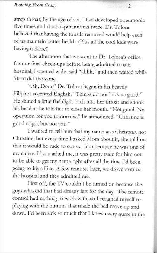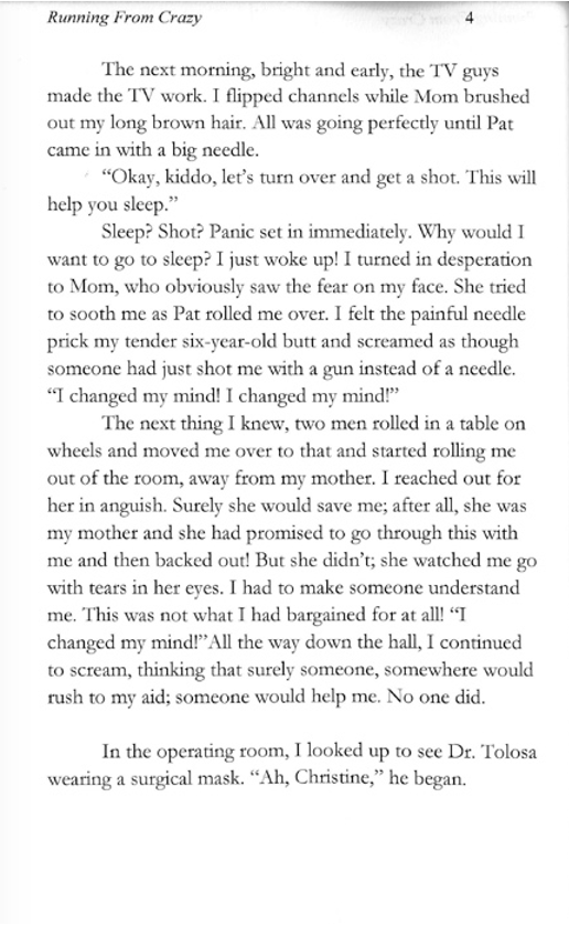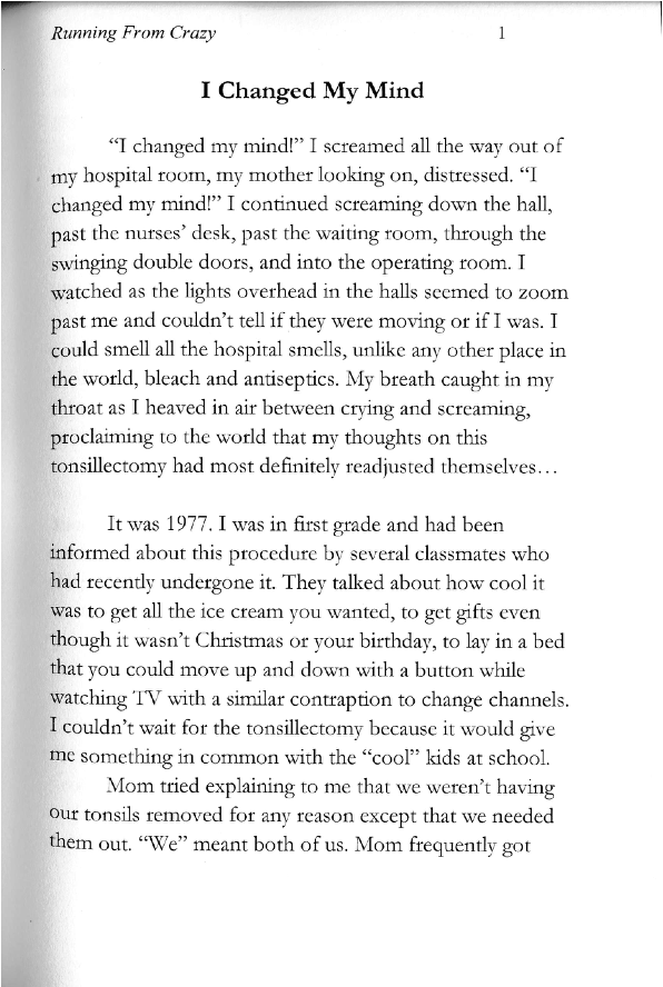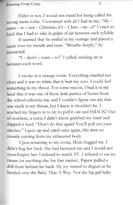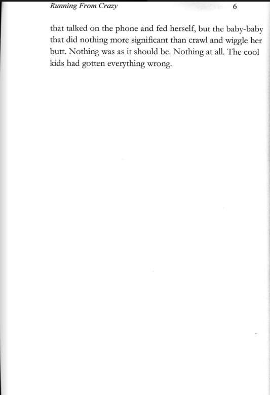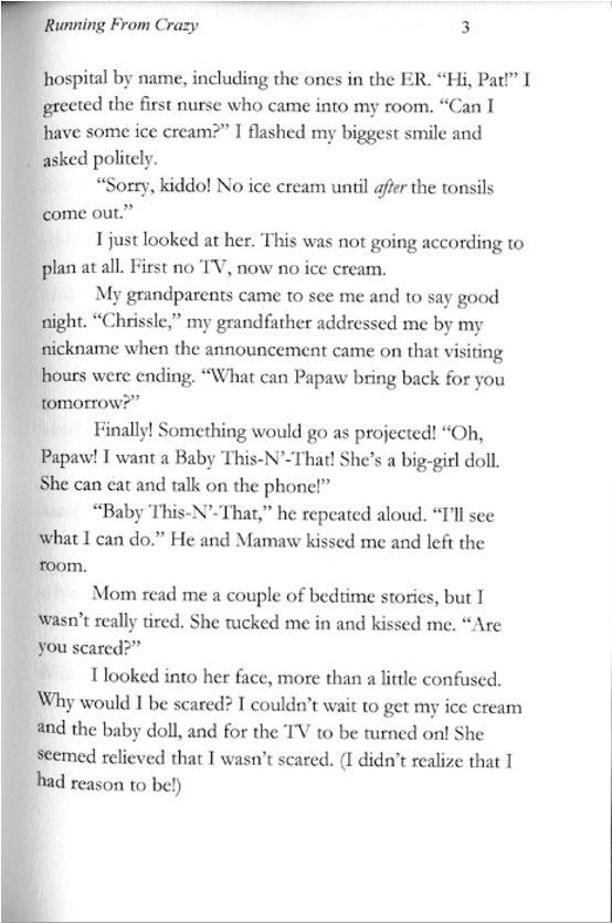 Running From Crazy is a delightful collage of memories woven into prose and poetry that is at times poignant and heartrending and at others is humorous and down-right wacky. Chrissie [Anderson] Peters has the remarkable ability to step back from her life and write about those terribly human moments – the ones we wish had never happened – until we grow up and realize they are the exact moments that make us the people we are today.
